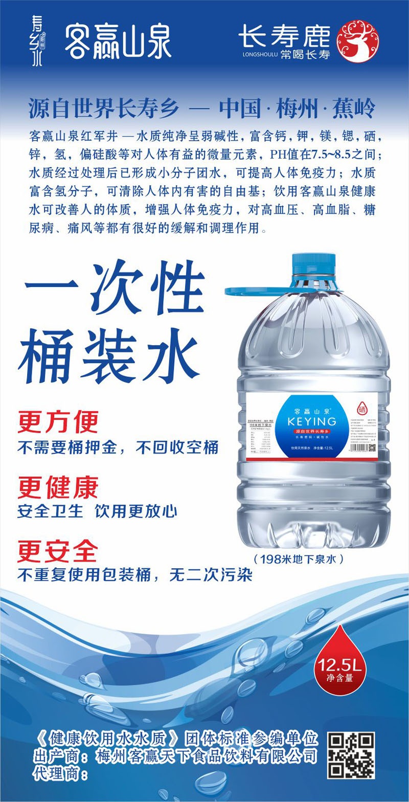 客贏天下--水源地位于廣東省蕉嶺縣華僑農(nóng)場(chǎng)北坑村五馬山,蕉嶺不僅是第七個(gè)世界長壽之鄉(xiāng),而且革命歷史悠久,1927年12月中共蕉嶺縣委成立,1928年建立工農(nóng)革命軍第十四區(qū)團(tuán)和蕉嶺紅軍獨(dú)立營,1929年聯(lián)合平遠(yuǎn)縣成立蕉平紅軍獨(dú)立營,1929年,軍長朱德帶領(lǐng)的紅四軍在蕉嶺三圳鎮(zhèn)停留了短短的兩天,為蕉嶺蘇區(qū)的土地革命指明了方向,使蕉嶺革命力量不斷發(fā)展壯大,給蕉嶺留打下了深深的紅色烙印,擴(kuò)大了共產(chǎn)黨和紅軍的政治影響. 蕉嶺華僑農(nóng)場(chǎng)北坑村有五座山連綿起伏,構(gòu)成“五馬歸槽” 的說法 ,民間稱為五馬山,也傳言是蕉嶺城的風(fēng)水寶地,寓意該地像馬一樣充滿活力和魅力。同時(shí), 該地又屬于生態(tài)嚴(yán)控保護(hù)區(qū),空氣中負(fù)氧離子含量豐富,每立方米達(dá)8000-50000個(gè)以上,是名副其實(shí)的天然“大氧吧”。山中云霧繚繞、清泉潺潺,泉水經(jīng)過百年的深巖層過濾及天然磁化,每一滴都不可復(fù)制,彌足珍貴,特別是水中富含鋅\硒、鍶、鈣、鍺、偏硅酸等天然礦物質(zhì),呈天然小分子弱堿性,經(jīng)權(quán)威認(rèn)證,屬世上罕見的珍貴飲用天然泉水,也是長壽之鄉(xiāng)——蕉嶺的廣大人民長期飲用的好水。